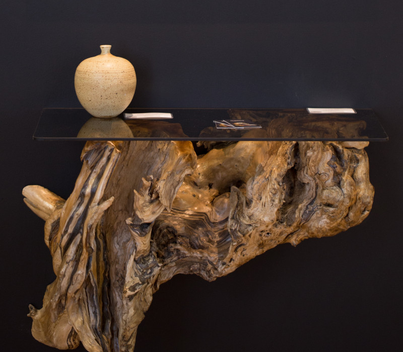 Thuya ancestral 19''H x 27''L x 14''P # Plateau verre teinté bronze.